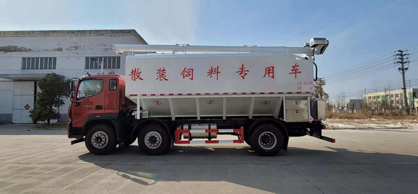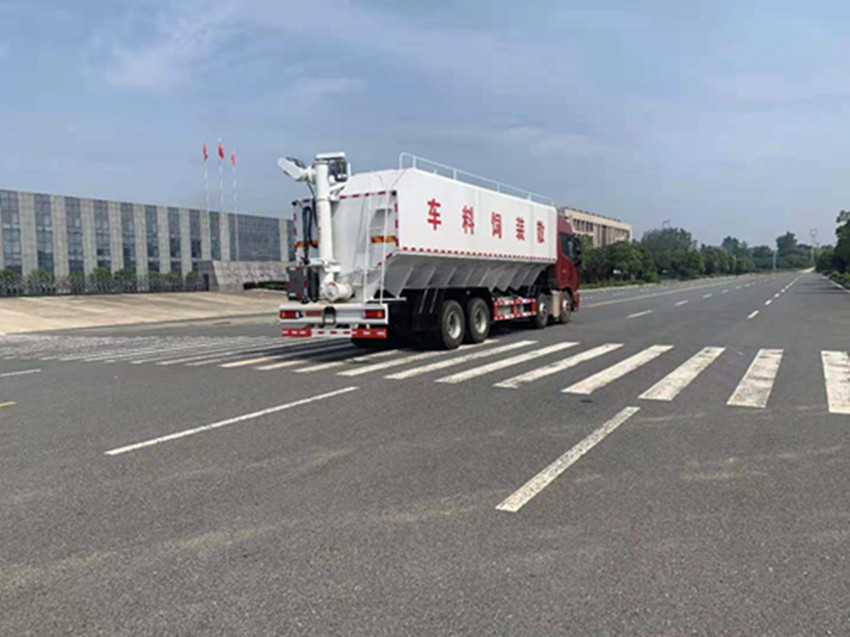 散裝飼料運輸車,散裝飼料車的飼料罐架設在卡車的底盤上,罐頂開有進料口.頂部的一根螺旋輸送卸料管(俗稱卸料絞龍)則可自由回轉和抬升,抬升的仰角可達60度。運輸時,頂部的螺旋管平臥在罐頂;卸料時則抬起,使管端的出料口與畜禽飼養(yǎng)場貯料罐頂部的進料門相接,駕駛室內(nèi)裝有操縱裝置(操縱裝置也可裝置在罐體尾部),卸料時通過車底的動力輸出軸和減速器來驅(qū)動螺旋,以完成卸料。