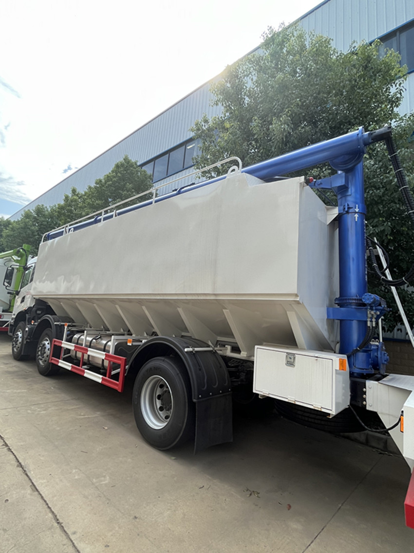 可獨立控制各分倉卸料順序和速度,整車3條蛟龍(底部水平絞龍、尾部垂直絞龍、頂部卸料絞龍),由取力器經車輛變速箱取力后,將動力傳動至高壓油泵以驅動液壓系統帶動各絞龍工作,或者由3個5.5kw 380v電機帶動各絞龍工作,頂部絞龍液壓控制舉升,可左右旋轉180°此車公告+環保+燃油齊全,全國上戶無憂!