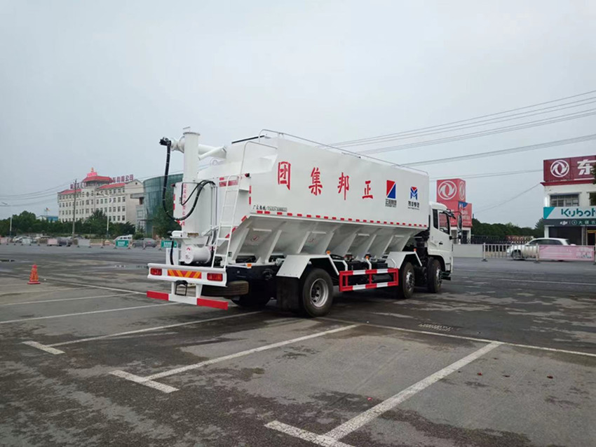 散裝飼料運輸車,散裝飼料車的飼料罐架設在卡車的底盤上,罐頂開有進料口.頂部的一根螺旋輸送卸料管(俗稱卸料絞龍)則可自由回轉和抬升,抬升的仰角可達60度。運輸時,頂部的螺旋管平臥在罐頂;卸料時則抬起,使管端的出料口與畜禽飼養場貯料罐頂部的進料門相接,駕駛室內裝有操縱裝置(操縱裝置也可裝置在罐體尾部),卸料時通過車底的動力輸出軸和減速器來驅動螺旋,以完成卸料。