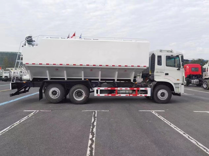 散裝飼料運輸車,散裝飼料車的飼料罐架設在卡車的底盤上,罐頂開有進料口.頂部的一根螺旋輸送卸料管(俗稱卸料絞龍)則可自由回轉和抬升,抬升的仰角可達60度。運輸時,頂部的螺旋管平臥在罐頂;卸料時則抬起,使管端的出料口與畜禽飼養場貯料罐頂部的進料門相接,駕駛室內裝有操縱裝置(操縱裝置也可裝置在罐體尾部),卸料時通過車底的動力輸出軸和減速器來驅動螺旋,以完成卸料。