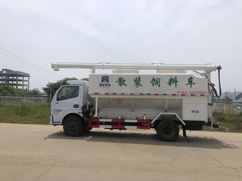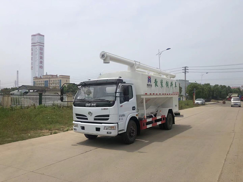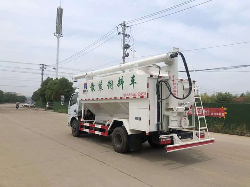 散裝飼料運輸車,散裝飼料車的飼料罐架設在卡車的底盤上,罐頂開有進料口.頂部的一根螺旋輸送卸料管(俗稱卸料絞龍)則可自由回轉和抬升,抬升的仰角可達60度。運輸時,頂部的螺旋管平臥在罐頂;卸料時則抬起,使管端的出料口與畜禽飼養場貯料罐頂部的進料門相接,駕駛室內裝有操縱裝置(操縱裝置也可裝置在罐體尾部),卸料時通過車底的動力輸出軸和減速器來驅動螺旋,以完成卸料。